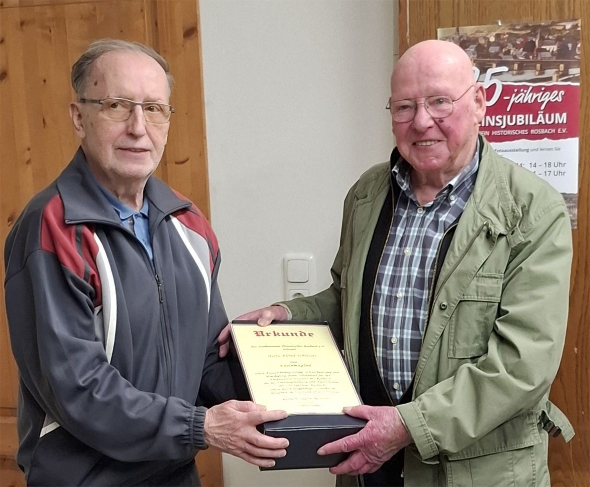 Für diese wertvolle Arbeit dankt der Förderverein Historisches Rosbach Alfred Schlösser mit der Verleihung der Ehrenmitgliedschaft und einem Präsent.