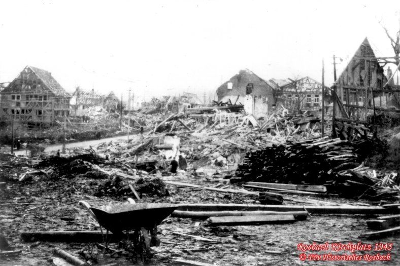Die Zeiger der Kirchenuhr blieben um 11.43 Uhr stehen, als die englische Bomberstaffel den Ort Rosbach zu einem Drittel verwüstet hatte. Offenbar wurde dem Dorf ein Wehrmachtsaufgebot, das eine Funkstation in einem Haus in der Nähe des Bahnhofs eingerichtet hatte, zum Verhängnis.