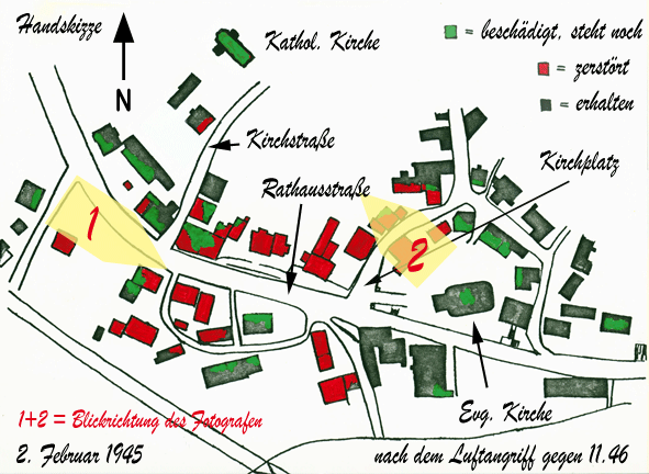 Die Ehefrau des Apothekers und die angehende Schwiegertochter haben im Keller überlebt. Dieser zweite Bombenteppich erfaßte auch das Bürgermeisteramt. Dort waren die meisten auch schon im Luftschutzkeller. Herr Klaus Nohl stand vor dem Bombenangriff mit Amtsinspektor Haas und Polizeimeister Krämer hinter dem Bürgermeisteramt in der Nähe der Kellertreppe.