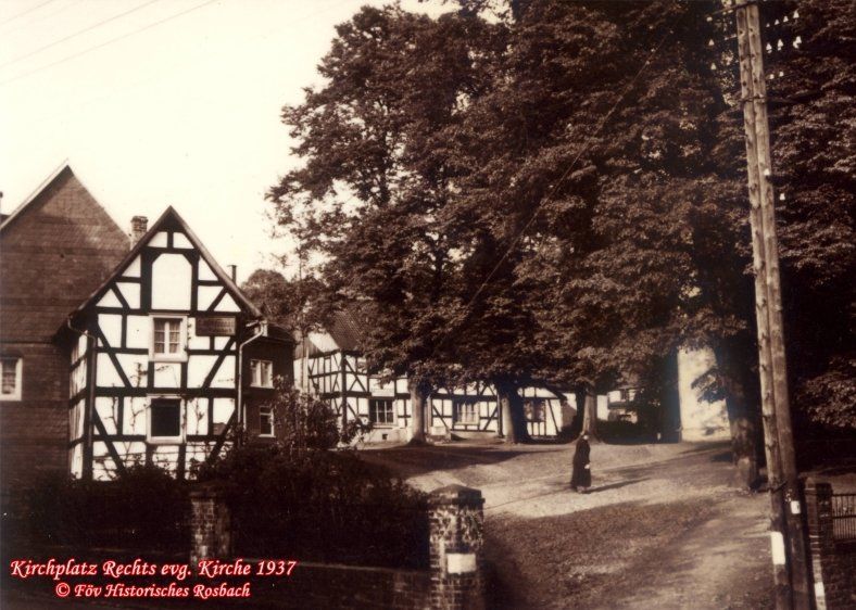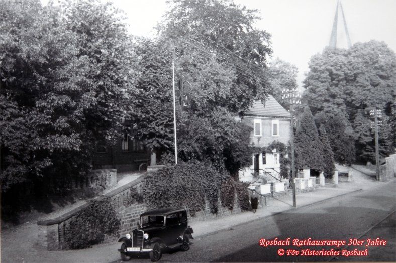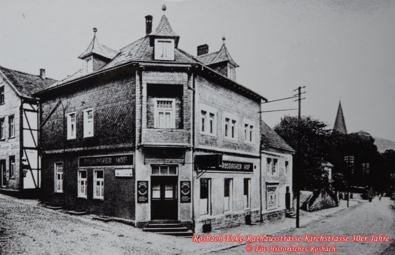 Der zweite Bombenteppich galt dem Ortskern Rosbach. Auch dort war manch einer trotz des Alarms um die Mittagszeit damit beschäftigt, das Mittagessen vorzubereiten, und darauf bedacht, es in den Wohnungen einzunehmen.Rathausstrasse/Markstrasse 30er Jahre